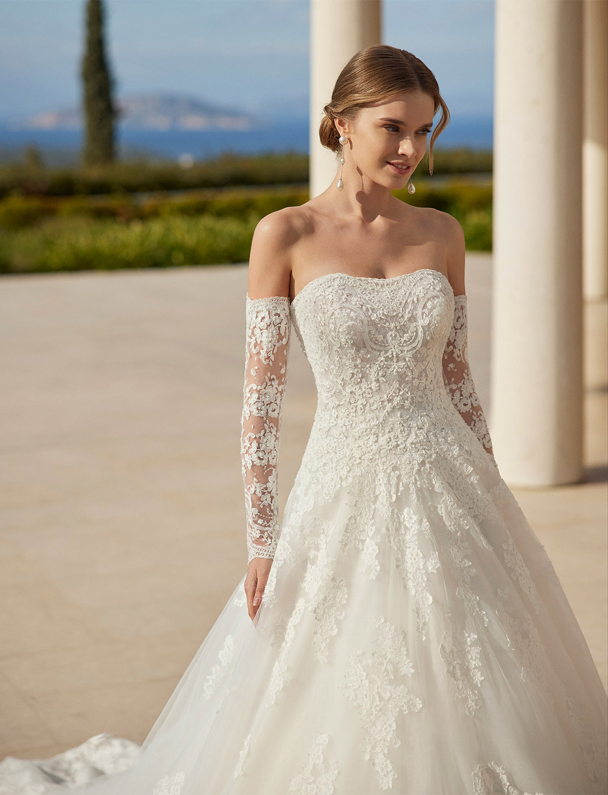 Abito da sposa Vincent di Rosa Clarà: il vestito da sposa principesco che incarna un sogno romantico. La sua silhouette A-line, con una gonna ampia e voluminosa in tulle, dona un’allure da fiaba. Il corpetto steccato, senza spalline, con scollo a cuore, è una vera opera d’arte di alta moda: i raffinati ricami in pizzo si uniscono a un sensuale gioco di trasparenze e applicazioni floreali. Le maniche lunghe staccabili, anch’esse ricamate in pizzo, permettono una doppia vestibilità, trasformando il look da romantico a sensuale con un solo gesto. Vincent è il vestito perfetto per la sposa che desidera combinare romanticismo, sensualità e un pizzico di magia.