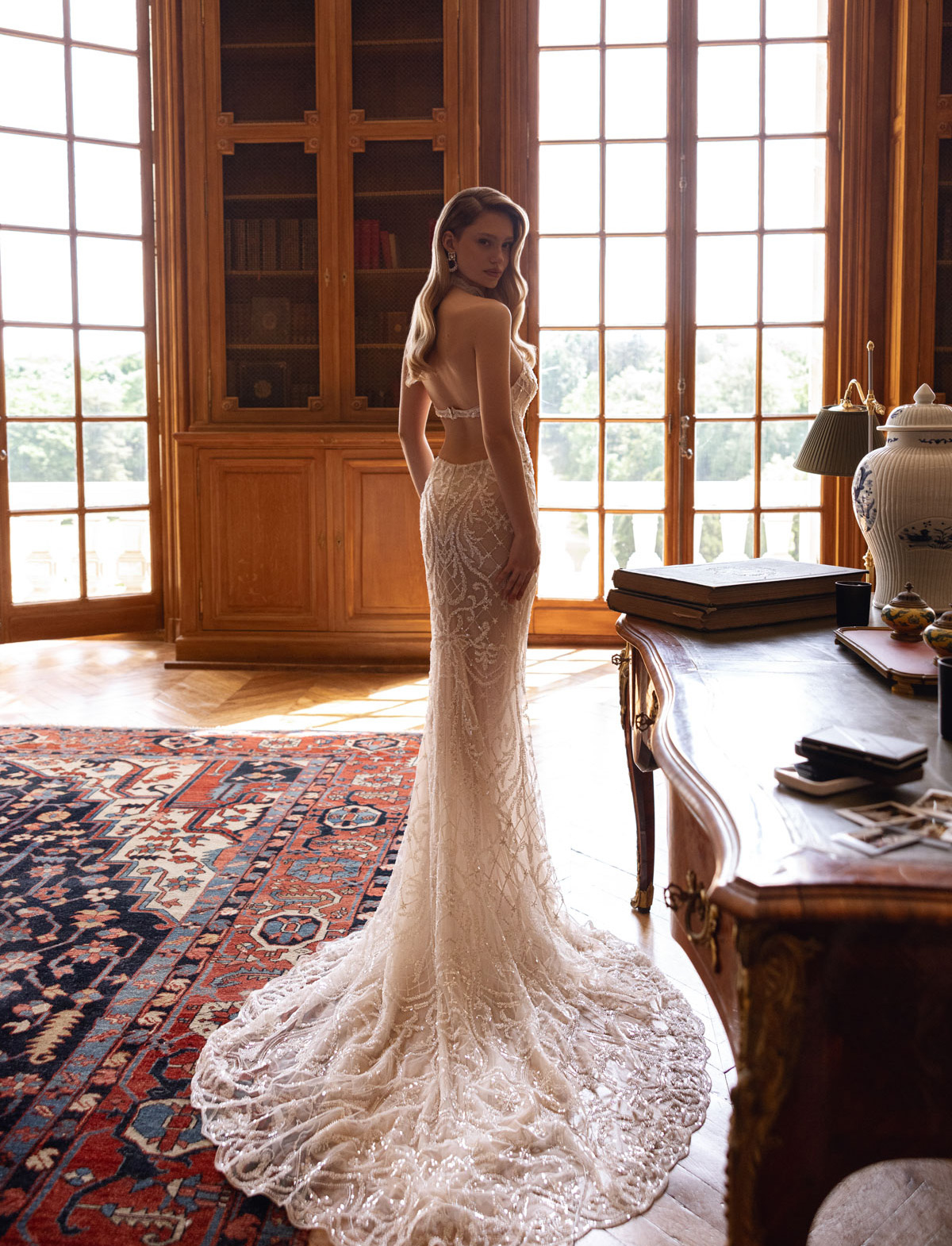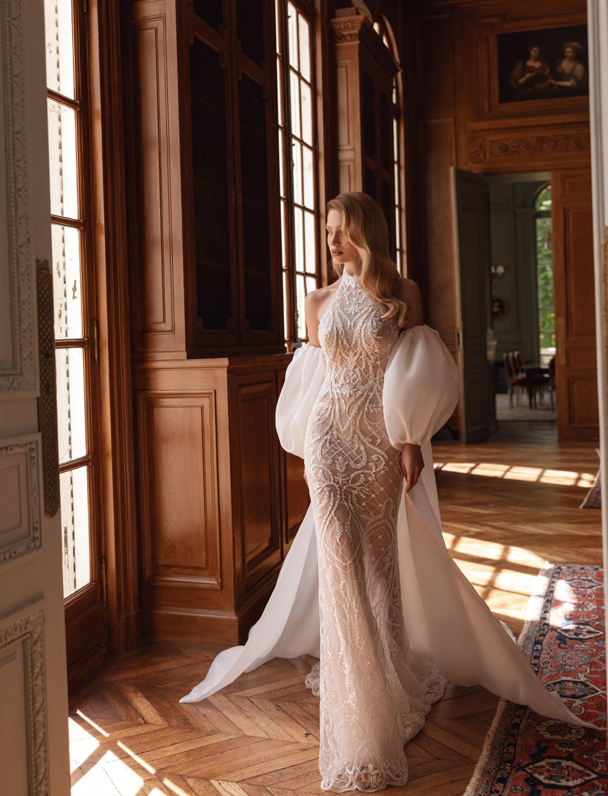 Ammira BOUDICA di TINA VALERDI, un abito da sposa moderno e seducente, che combina audacia e sofisticazione per una sposa dalla forte personalità. Questo vestito da sposa a sirena, con la sua silhouette aderente e un’elegante trasparenza, è un tripudio di ricami scintillanti che creano un effetto luminoso e ipnotico. Il corpetto con collo alto all’americana e le profonde aperture laterali aggiungono un tocco di audacia glamour. Le maniche a sbuffo in tulle, staccabili, offrono versatilità e un’atmosfera eterea, perfette per un cambio look. BOUDICA comunica un’eleganza raffinata e contemporanea, ideale per la sposa che desidera lasciare un segno. Vieni a provarlo all’Atelier Le Spose di Mori.