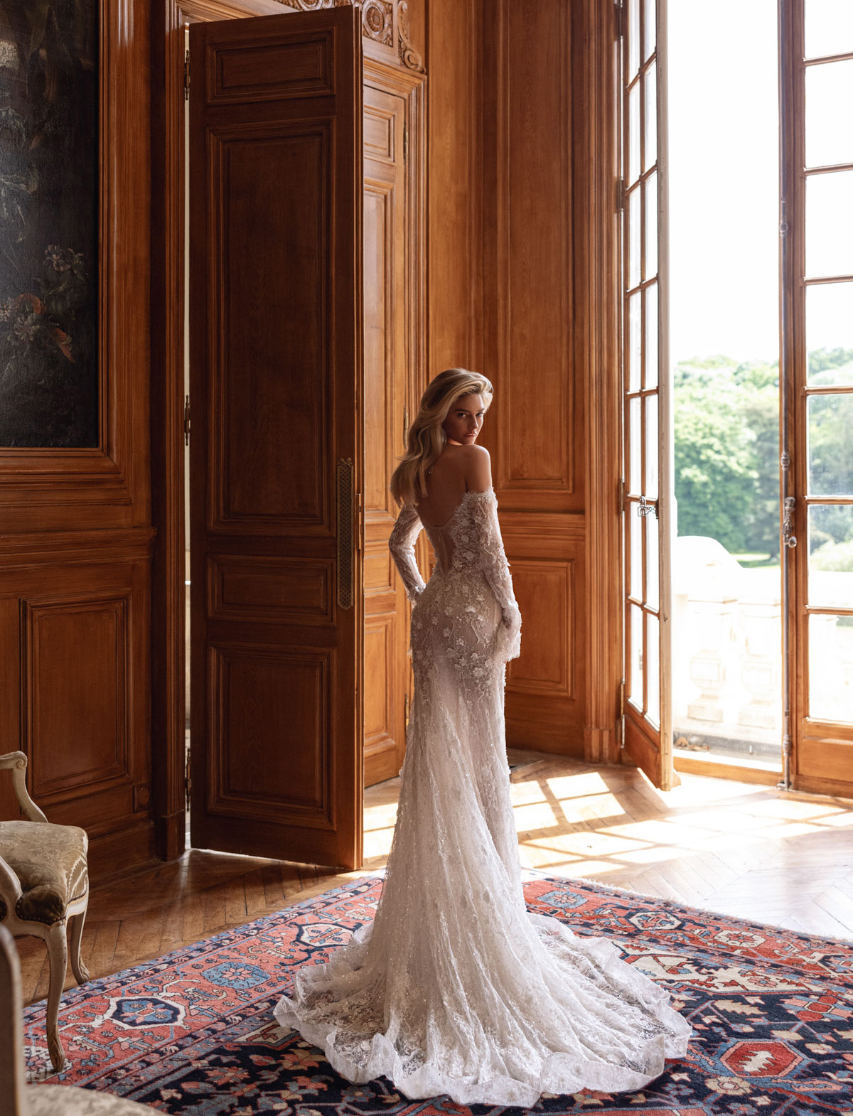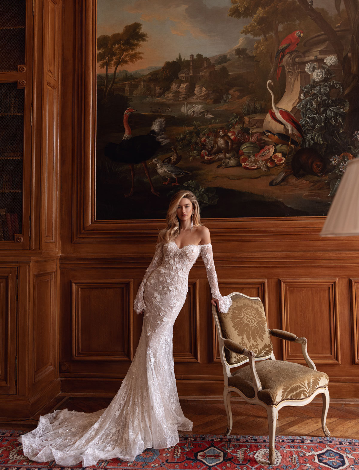 Preparati a innamorarti di CATALINA di TINA VALERDI, un abito da sposa sensuale e sofisticato, perfetto per la sposa che desidera una presenza indimenticabile. Questo vestito da sposa a sirena, con la sua silhouette aderente e un sinuoso strascico, è interamente ricamato con applicazioni floreali 3D e scintillanti paillettes, creando un effetto lussuoso e moderno. Il corpetto con scollo a cuore e le maniche lunghe off-shoulder in pizzo aggiungono un tocco di eleganza romantica e seducente, esaltando le spalle in modo raffinato. CATALINA è l’abito da sposa ideale per una sposa glamour che vuole unire stile classico e dettagli audaci. Scopri CATALINA presso l’Atelier Le Spose di Mori.