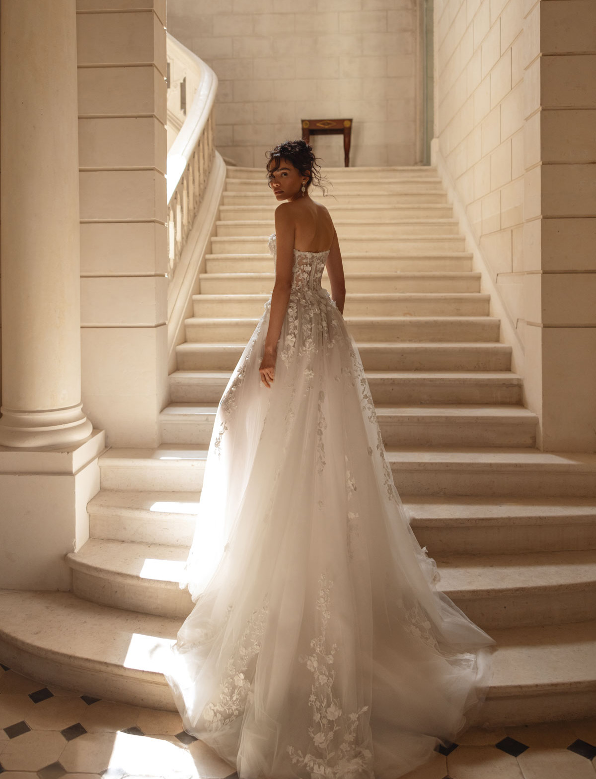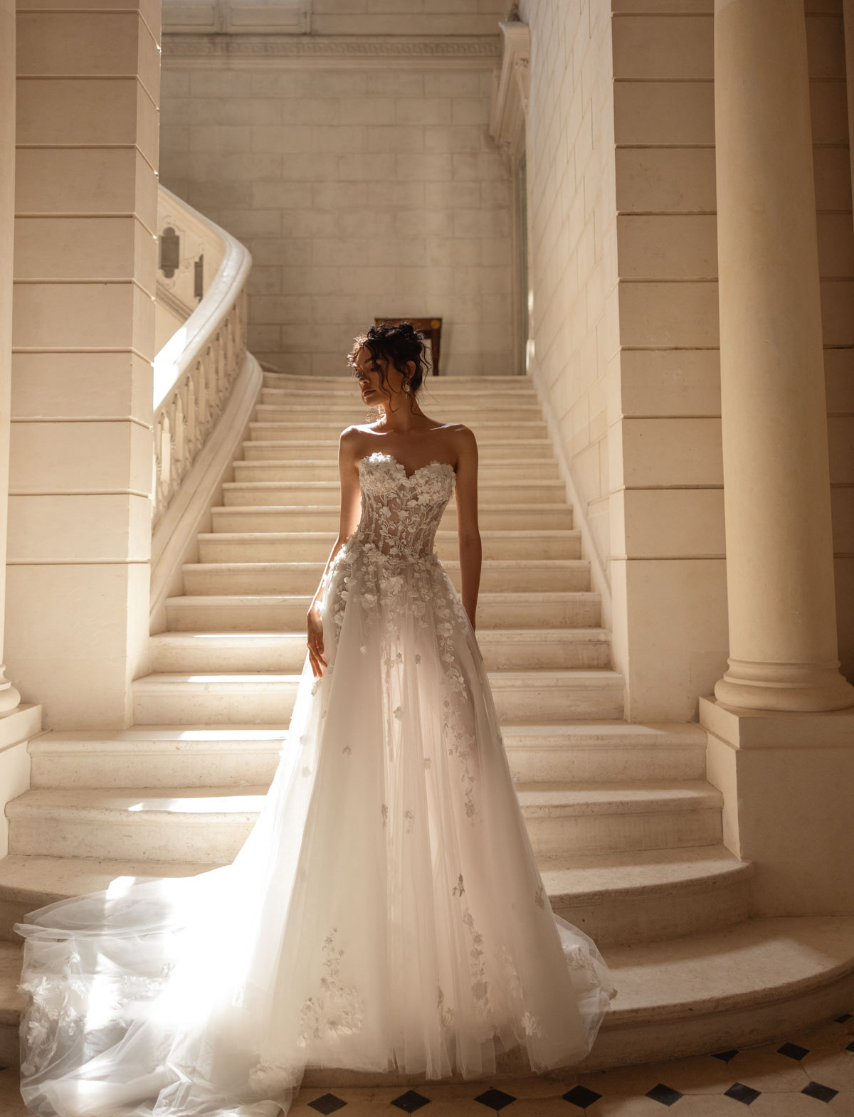 Con DOMNA di TINA VALERDI, ogni sposa si sentirà una vera principessa. Questo abito da sposa principesco cattura l’essenza della favola con la sua sontuosa gonna ampia in tulle, che scende morbida e voluminosa creando un’atmosfera eterea. Il corpetto a cuore è un capolavoro di lavorazione artigianale, adornato da delicate applicazioni floreali 3D e ricami in pizzo che sembrano sbocciare sulla pelle. La silhouette A-line conferisce grazia e leggerezza, mentre i dettagli sartoriali esaltano la femminilità. DOMNA è il vestito da sposa romantico per eccellenza, pensato per la sposa classica che desidera un tocco di magia. Vieni a scoprire la sua bellezza presso l’Atelier Le Spose di Mori.