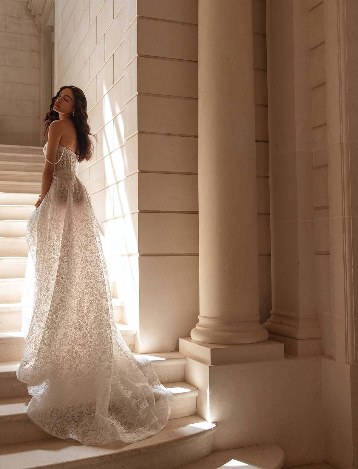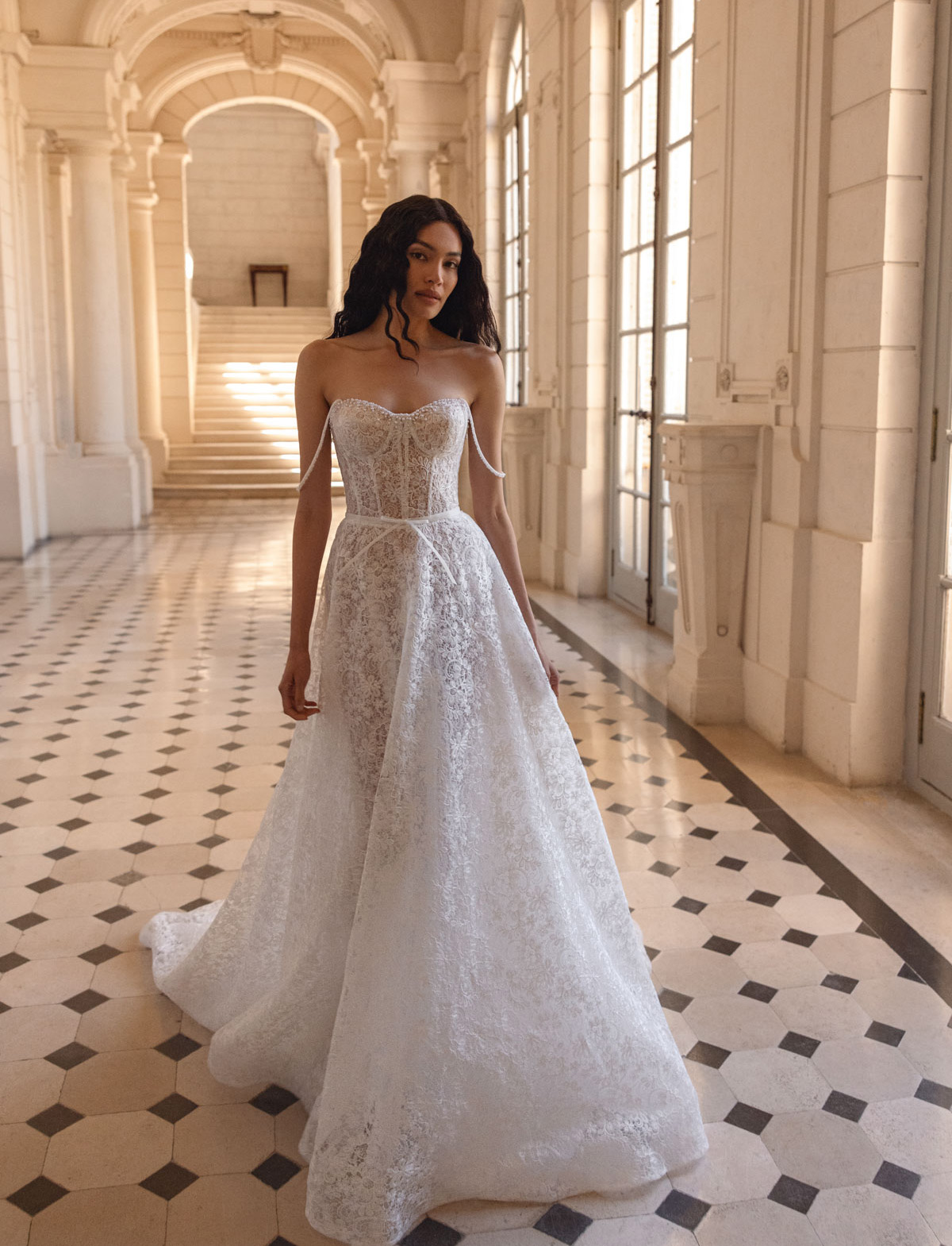 Immergiti nell’eleganza senza tempo con KALLIROI di TINA VALERDI, un abito da sposa che unisce romanticismo e raffinatezza. Questo incantevole vestito da sposa sfoggia una silhouette A-line con una gonna ampia e luminosa, interamente rivestita da un delicato pizzo floreale che le conferisce una texture ricca e dettagliata. Il corpetto a cuore, finemente steccato, è adornato da preziose perline e sottili spalline gioiello, che aggiungono un tocco di luce e glamour. KALLIROI è l’abito da sposa ideale per la sposa classica e sofisticata che desidera un look regale e indimenticabile. Vieni a scoprire KALLIROI e tutti i dettagli sartoriali all’Atelier Le Spose di Mori.