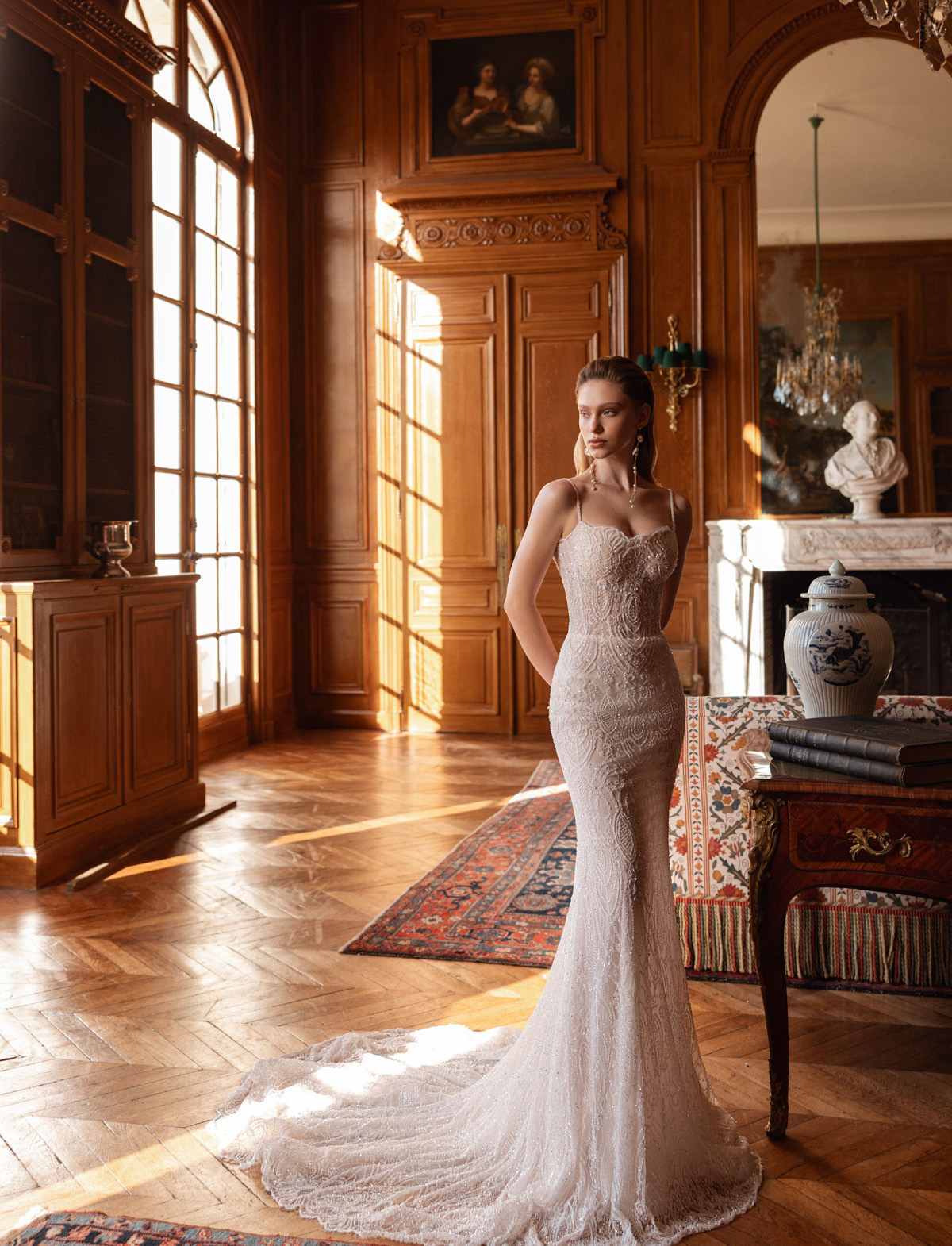 Ammira ORLA di TINA VALERDI, un abito da sposa sensuale e luminoso, pensato per la sposa che desidera un’eleganza che incanta. Questo vestito da sposa a sirena è un inno alla femminilità, interamente ricamato con perline e cristalli che creano un effetto “sparkle” abbagliante. Il corpetto a bretelline sottili, con un design bustier finemente steccato e scollo a cuore, valorizza la silhouette con un tocco audace e sofisticato. Le lavorazioni artigianali dei ricami donano all’abito un’allure preziosa e unica. ORLA comunica un’atmosfera glamour e all’avanguardia, ideale per la sposa che vuole brillare con una luce inconfondibile. Scopri ORLA all’Atelier Le Spose di Mori.
