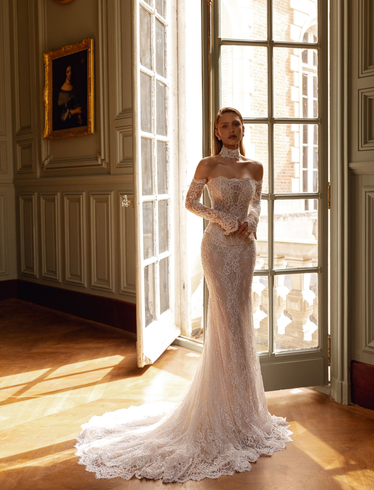 Riscopri la sensualità con SERA di TINA VALERDI, un abito da sposa moderno e seducente, ideale per la sposa che desidera audacia e glamour nel suo giorno speciale. Questo vestito da sposa a sirena, con la sua silhouette aderente, è interamente ricamato con un prezioso pizzo scintillante e perline, creando un effetto “sparkle” che cattura ogni luce. Il corpetto senza spalline, dal design bustier finemente steccato e con scollo a cuore, esalta la figura con trasparenze audaci. Le maniche lunghe in pizzo, staccabili, aggiungono un tocco di eleganza sofisticata e versatilità. SERA comunica un’atmosfera di lusso e fascino, perfetto per la sposa che vuole lasciare un ricordo indelebile. Ammira SERA all’Atelier Le Spose di Mori.