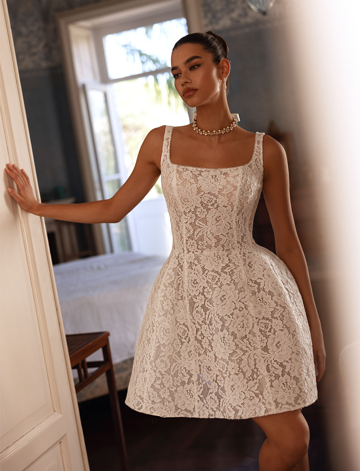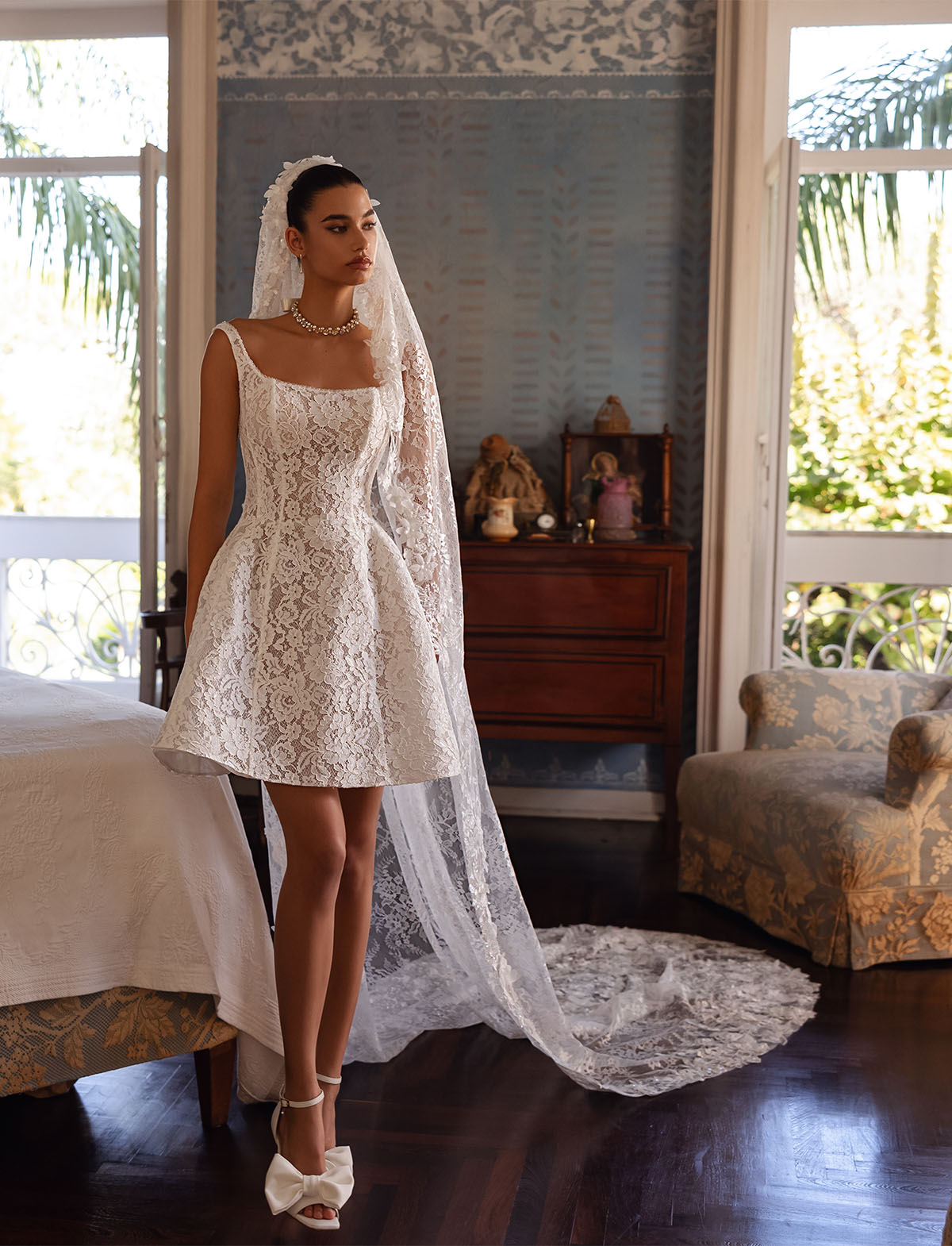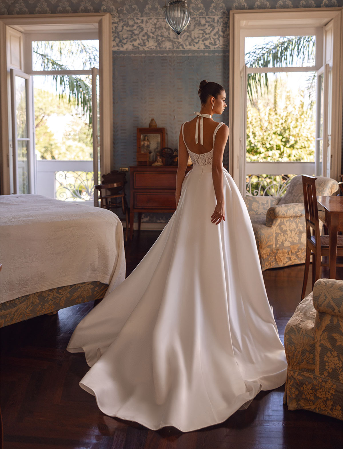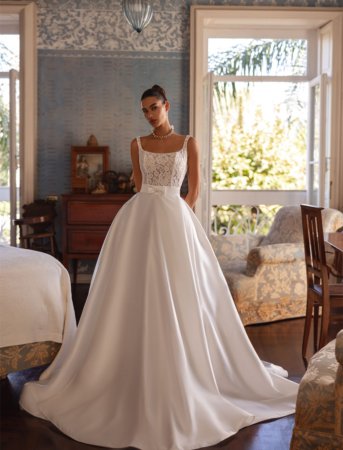 TINA VALERDI presenta SIMONETTE, un abito da sposa moderno e versatile, perfetto per la sposa che cerca originalità. Questo incantevole vestito si distingue per il suo design trasformabile: un mini abito in pizzo con corpetto steccato e scollo quadrato, ideale per un look sbarazzino, si trasforma in un abito principesco grazie ad una gonna ampia in mikado rimovibile. Dettagli come il fiocco in vita e il raffinato pizzo rendono “Simonette” un vero gioiello sartoriale. Ideale per la sposa glamour e contemporanea, lo trovi all’Atelier Le Spose di Mori.
